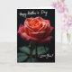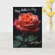 Designed with a tall, eye-catching layout, the card centers on a single rose in full bloom against a deep black background. The petals shift from a warm orange glow at the tightly curled center to coral and deep red along the outer edges, creating a tender, romantic look ❤️. Tiny water droplets cling to the petals like little beads, catching the light and adding a fresh, just-misted texture. The background fades softly, with only a faint suggestion of green leaves below so the flower stays front and center. At the top, “Happy Mother’s Day” appears in white, flowing lettering that stands out clearly against the dark space. Near the bottom, “I Love You!” is placed in matching white text, sitting close to the base of the bloom for an intimate feel 🌼. Soft lighting traces the curved petal edges and makes the droplets sparkle across the rose’s surface.