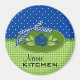 Polka Dot Roses Refrigerator Magnet, Blue-is a graphic art design. The top portion of the background is blue and white polka dots. The bottom half is green and white polka dots. A thin green ricrac ribbon divides the two patterns. In the center is a green oval shape holding a blue rose with green leaves. A checkered blue and white bow embellishes the oval. I have placed two text areas on the magnet for you to personalize. Replace the word NAME with a person's name. The second word says Kitchen. Both text areas can be edited or deleted if you prefer. This polka dot roses design is available in several assorted colors.