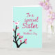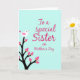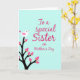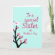 This card features a light teal background that feels calm and open, with a hot pink message centered near the top reading “To a special Sister on Mother’s Day.” The lettering is smooth and flowing, standing out clearly against the cool backdrop, like a loving note meant to be noticed ❤️. From the lower-left corner, a black branch reaches upward and across, adding a gentle sense of direction toward the words. Along the branch sit bright pink blossoms with small yellow centers, their curved petals suggesting an affectionate, almost companionable flourish 🌼. A small white bird perches on one of the upper twigs, marked with a single black eye and tiny pink accents on its wing and tail. Its head tilts toward the message as if sharing a quiet, tender moment with the reader. The black branch and clustered flowers rise from the bottom-left and angle toward the center, while the bird rests near the upper portion of the branch beneath the pink text.