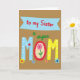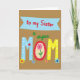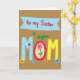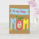 This card features a warm earthy brown background that sets a cozy, affectionate tone. Near the top, a light blue banner stretches across with the words “to my Sister” written in red, centered and easy to spot. Just below, “a super” appears in green lettering that leans forward with a friendly, upbeat feel. The main focus is “MOM” in large decorative letters, where the first M is sky blue with white polka dots and a small red heart tucked inside ❤️. The O becomes an oval picture framed in red with white dots, showing a soft pink flower with a green stem on a creamy backdrop 🌼. The last M is sunny yellow with matching white polka dots, giving the layout a bright, caring energy. Along the bottom edge, small flowers in yellow, blue, orange, and pink are scattered like a little garden border.