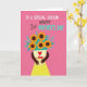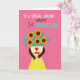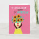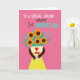 This greeting card features a bright fuchsia background that instantly draws the eye, with a celebratory message set across the top in white, dark gray, and teal lettering. Centered below, an abstract motherly figure with warm, dark-toned arms gently cradles a full bouquet, creating a tender, close-to-the-heart feeling ❤️. The figure wears a light cream top with a red heart emblem on the chest and a small matching bow near it, like a quiet sign of affection. A sunny yellow skirt sprinkled with white polka dots adds a light, friendly rhythm to the scene. Where a head would be, five golden-orange flowers bloom like cheerful faces, each with a deep brown center that feels warmly grounded 🌼. Teal leaves arc outward around the bouquet, dotted with tiny blue berry-like accents that add contrast and balance. The overall look stays flat and graphic with crisp edges and big areas of color, keeping the focus on the caring gesture. The top text sits above the figure while the bouquet fills the middle, framed by teal foliage against the fuchsia backdrop.
