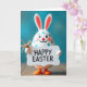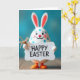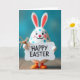 This design shows an egg-shaped bunny figure standing on a warm wooden surface, with tall white ears that have red inner panels and a smooth white body dotted with medium-blue circles. Its face has wide, friendly eyes, pink cheeks, a tiny red nose, and a curved smile that feels like it’s directed at someone just off to the side, like a quiet shared joke between friends 🐰. Small orange feet peek out at the bottom, adding a bright accent against the wood grain. Behind the figure, the background fades into a soft sky-blue haze that keeps the scene calm and airy. Centered in front, the character holds a white plaque with a lightly decorative edge, as if presenting it with gentle pride 🐇. The greeting text sits in the middle of the plaque in black, clear lettering, easy to read at a glance. A simple jute-twine bow is tied along the left edge of the plaque, with rough fibers and a small knot visible against the smooth white surface. The light falls evenly across the ears, plaque, and dotted body, leaving soft shadows under the feet and along the bottom edge of the sign.