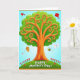 This card shows a stylized tree with a sturdy orange trunk and a rounded canopy of green leaves, set against a calm blue sky. Curled orange branches stretch outward like gentle flourishes, giving the scene an airy, affectionate feel. At the base, a rolling green hill holds scattered red and pink flowers 🌼, like small notes of care placed around the roots. Around the tree, a red bird, a red diamond-shaped kite, a small brown hanging ornament, a striped buzzing insect, and a tiny white winged creature drift along dotted paths, as if they’re circling each other in friendly company ❤️. A pair of tiny white baby shoes hangs lightly from a branch, adding a tender family touch without crowding the scene. The message “Happy Mother’s Day!” sits along the lower foreground in green lettering, easy to spot against the hill. The dotted flight lines arc in soft curves across the sky, and the flowers appear as simple five-petal shapes near the tree’s base.