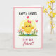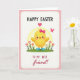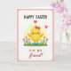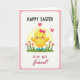 This design shows a round little bird in sunny yellow with softly blushed cheeks, standing on a bright green patch of grass as spring flowers rise around it 🌷. A pink bow at its neck and small blue boots give it a dressed-up look, like it’s ready to meet a close friend. Behind the bird, a pale yellow circle reads like gentle sunlight, softening the scene and drawing your eye to the center. To the right, a small pink butterfly hovers nearby, as if lingering for a quiet hello 🐇. The main illustration sits inside a white panel with rounded corners, bordered by a pink frame dotted with evenly spaced white polka dots. At the top, a short holiday greeting appears in black letters, and a second line of smaller text sits below it in light pink, centered above the character. The bird’s bow is bright pink, and its blue boots are shaded to look slightly glossy.