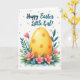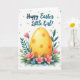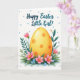This card features a large sunny yellow egg shape with orange polka dots nestled into a thick patch of green leaves, like it’s being gently tucked in for a sweet spring surprise 🐰. Around the greenery, bright pink flowers with yellow centers lean inward as if gathering close like friends. Smaller sky-blue blossoms peek out between stems, adding a soft contrast that keeps the garden scene feeling light and airy 🌷. The background stays white, making the colors stand out while keeping the layout uncluttered. Near the top, a short greeting sits centered in dark teal lettering, with the words spaced evenly above the illustration. Tiny blue dots and petite floral marks are scattered around the main cluster, like confetti drifting in the air. Subtle shading along the leaves and egg gives the arrangement a gentle, rounded depth. The pink petals curve upward with yellow centers glowing against the surrounding green sprigs.