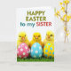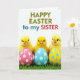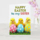 Designed with three fluffy, golden baby birds gathered front and center, this spring scene shows them leaning close as if sharing a gentle moment of friendship 🐰. In front of them sit three glossy, egg-shaped ornaments with neat polka dots, one in deep pink, one in light blue, and one in sunny yellow. The birds rest on a patch of rich green grass, with individual blades peeking up around the eggs like fresh new growth. Above the illustration, a short Easter greeting appears near the top, set in mixed-color lettering that stands out against the white space. Soft lighting brings out the downy texture of the chicks and the smooth shine on the dotted eggs, adding a tender, cozy look 🐇. The simple white background keeps the focus on the trio and their close, affectionate grouping. At the top, the greeting is centered, and the dotted eggs line up along the lower foreground in pink, blue, and yellow.