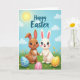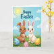 Designed with two stylized rabbits standing close together, one soft brown and the other bright white, their wide shiny eyes and rosy cheeks give them a tender, friendly look 🐰. They’re placed front and center on an emerald-green lawn sprinkled with tiny yellow flowers, like they’ve wandered into a quiet spring morning. In the foreground, three decorated eggs rest on the grass: one blue with white stripes and small pink flowers, one pink with white polka dots, and one yellow with white polka dots 🌷. Above them, a pale blue sky fades gently upward, with puffy rounded clouds drifting across. A warm yellow sun sits high and casts a soft glow that makes the pair seem even more affectionate as they face forward together. Near the top of the card, the greeting text is set in teal, centered and easy to spot against the sky. The characters and eggs have a smooth, rounded, almost sculpted look, while the grass shows fine texture beneath them. The upper area features teal lettering over the light blue sky, with clouds nearby and the yellow sun shining to the side.