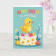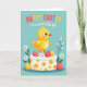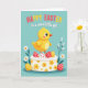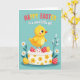 This card features a plump golden-yellow baby bird with wide, gentle eyes and a small orange beak, perched atop a round frosted cake as if posing for a sweet springtime moment 🐰. The cake is iced in white with a piped border, decorated with yellow flower shapes, and dotted with speckled egg-shaped treats in red and sunny yellow with tiny white spots. Behind it all, a cool turquoise background reads like a calm spring sky, letting the warm yellows stand out. Along the bottom edge, white daisies with orange centers and green leaves gather closely, with a few slender reeds rising like quiet company around the scene 🌷. At the top, a cheerful greeting is placed in a flowing lettering style, mixing red, yellow, and white so it stands out against the turquoise. The baby bird’s faint rosy blush and the careful way it leans forward give the scene a friendly, affectionate tone, like it’s sharing the cake with someone just out of frame. The egg-shaped decorations sit nestled in the frosting ring, with red and yellow surfaces sprinkled in neat white polka dots.
