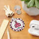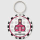 A keychain featuring a black and white polka dot background. Logo of Pink Schoolhouse inside a hot pink frame. Personalize with your name.