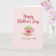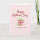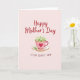 This card shows a soft blush-pink background with a pale pink teacup and saucer centered like a quiet invitation to pause together ❤️. The cup has a thin golden rim and a deep red heart on its side, hinting at affection in a simple, cozy way. Instead of tea, small white blossoms and touches of green foliage spill upward, like a gentle bouquet offered to someone cherished. A single green sprig rests on the saucer, adding a small, tender detail that feels like it was placed with care 🌼. Near the top, the words “Happy Mother’s Day” appear in flowing red lettering, standing out clearly against the light backdrop. Beneath the teacup, a shorter line of text in matching red sits centered, addressed to a loved one in a quiet, intimate tone. The colors stay soft and harmonious—creamy whites, pale pinks, and rich reds—while the teacup’s heart motif remains the strongest accent on the front. The white flowers rise from the cup in a rounded cluster, with tiny green leaves peeking between the petals.