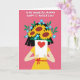 This card shows a flat, digitally illustrated scene on a deep fuchsia background, using simple shapes that feel friendly and close. In the center stands a small human figure in a lemon-yellow dress with faint pale dots, cinched with a bright red ribbon tied into a bow. Instead of a face, the figure’s head becomes a bouquet, like they’re leaning forward to offer flowers with quiet affection ❤️. The bouquet mixes golden-yellow blooms with small sky-blue five-petal flowers and leafy green sprigs, creating a soft, romantic exchange without needing expressions. In the figure’s hands is a white card featuring a large red heart, held carefully as if it’s meant for someone special. Across the top, a short message appears in crisp white letters, spaced neatly above the illustration like a headline. The red bow at the waist is centered and sharply defined against the yellow dress, and the heart on the little white card sits solidly in the middle 🌼.