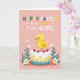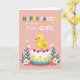 This card shows a soft, powdery pink background with a plump yellow baby bird centered low in the design, its orange beak and tiny rosy cheeks lifted in an affectionate upward gaze that feels like it’s looking at someone it trusts. The bird stands on a smooth white cylinder that’s trimmed with little tufts of green grass and scattered mini blossoms in yellow and orange, like a small spring garden. Around the base sit four glossy red round treats dotted with small white spots, adding a sweet, celebratory touch. Green leaves and daisy-like flowers in white and pale pink frame the lower area, creating a gentle, close-together “bouquet” look that suggests friendship and care. Near the top, the greeting text is arranged in stacked lines, mixing bright yellow and deep teal letters with smaller white lettering for contrast. A couple of tiny spring accents, like 🌷 and a small 🐰 detail, fit naturally with the Easter theme without crowding the scene. The red dotted treats cluster near the bottom edge while the flowers arc upward along both sides toward the text.