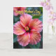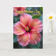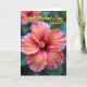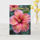 Designed with a large tropical flower as the focus, the card shows layered petals that curl outward like a gentle embrace, hinting at affection and closeness ❤️. The petals shift from soft coral-pink along the edges into deeper fuchsia and rich crimson toward the center, with faint ripples that make them look velvety. Warm, diffused lighting gives the bloom a soft glow, as if it’s being admired in a quiet, intimate moment. In the middle, a tight cluster of golden-yellow anthers rises from the central pistil, adding a bright spark against the reds and pinks 🌼. Behind the flower, dark green leaves fade into a smooth blur, creating a calm garden backdrop that keeps the attention on the bloom. Across the upper portion, a short celebratory message sits in glittery gold lettering, arcing slightly and standing out clearly against the darker greens. The gold text looks lightly dusted with sparkle, and the flower’s center shows tiny yellow tips clustered like a small sunburst.