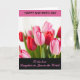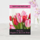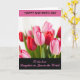 This card features a close-up bouquet of tulips that feels like a quiet moment shared between close friends ❤️. Crimson and soft pink blooms fill the center, with petals fading from blush to deeper rose along their edges, as if leaning toward one another. Fresh green stems and leaves add a crisp contrast, grounding the flowers against a softly blurred, light background. The focus stays sharp on the front petals, while the rest gently softens into the distance, giving the arrangement a tender, intimate depth. Across the top sits a wide fuchsia band with dark lettering centered in a strong, easy-to-read style. Along the bottom, a deep charcoal panel carries flowing pink lettering that stretches neatly across the space, adding a sweet, romantic touch 🌼. The overall layout frames the flowers like a keepsake photo, with the top band and bottom panel creating clean borders around the bouquet. The tulips sit centered between the fuchsia header and the charcoal footer, with the pink lettering standing out against the dark base.