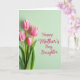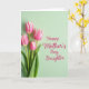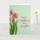 This card shows four tulips clustered along the left side, their slim green stems and leaves leaning close together like a gentle hug ❤️. The blossoms shift from a rich pink near the center to a soft creamy white at the edges, with fine lines that make the petals look tender and fresh. A calm pastel mint-green background fills the rest of the space, giving the flowers plenty of room to stand out without feeling busy. Soft, diffused lighting smooths the scene and adds a quiet, affectionate mood, like a caring glance shared between loved ones. On the right side, the message “Happy Mother’s Day, Daughter.” is written in a flowing style, set in a deep rose color that echoes the tulips. The text sits comfortably in the open area of the background, aligned to the right so the flowers and words feel balanced 🌼. The petals show subtle texture and gentle shading, while the leaves look crisp with slightly darker green along their edges. The mint-green background appears even and airy, with the tulips anchored to the left and the rose-colored lettering on the right.