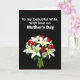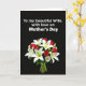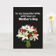 This card features a deep black background that makes the flowers and lettering stand out with dramatic contrast ❤️. Near the top, large white text reads, “To my beautiful Wife, with love on Mother’s Day,” centered and easy to spot at a glance. The words feel intimate, like a close embrace, as they hover above a bouquet arranged with care. White lilies open wide at the center, showing golden stamens, while red roses nestle between them like quiet romantic notes. Small white daisies with sunny yellow centers add a gentle, friendly touch 🌼. Green stems gather neatly at the base, giving the arrangement a fresh, just-picked look. Thin red lines frame the top and bottom edges, echoing the roses against the dark backdrop. The bouquet sits below the text, with bright whites, rich reds, and crisp greens glowing against the black field.