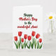 This greeting card features a white background that keeps everything airy and focused, like a quiet space set aside for someone cherished ❤️. Across the upper area, the large headline reads “Happy Mother’s Day” in flowing red lettering, giving the words a tender, affectionate presence. Just beneath and slightly tucked between lines, “to the” appears in green, acting like a gentle bridge in the message. The phrase “wonderful Aunt” returns to red and sits prominently in the same upper section, balancing the layout with a warm, close-to-the-heart feel. Along the bottom third, seven simple spring flowers line up like a friendly little garden, their soft red petals suggesting a caring gesture shared between family members 🌼. Each bloom rises at a slightly different height on thin green stems, with narrow leaves reaching upward as if leaning in toward the message. The petals show light-to-deeper red shading that mimics a watercolor look, and the row of flowers forms a loose, wavy border across the lower edge.