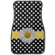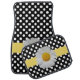 Girly car mats done in a black and white polka dot pattern, with graphics of a yellow band, with a large single yellow and white daisy. Customize to add text to this lovely design.