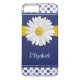 Navy blue, sunny yellow and white polka dots, daisy and ribbon personalized case. A fun, girly design to help protect your iPhone. You can personalize the name.