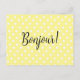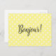 Polka dots on yellow postcard with the word BONJOUR spelled out in pretty typography letters. French for Hello.