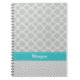 This pretty and stylish notebook has a cute light gray and aqua blue quatrefoil and polka dot pattern design. Personalize this modern spiral notebook with any name.