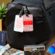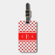 Monogram Luggage Tag with initials on red band with white border over polka heart pattern
