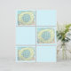 A lovely polkadot flower, created in mixed media, is presented in aqua and lime green with tiny white dots in its center, mounted on a cool shade of pale blue.