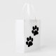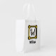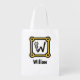 Letter in a golden frame with name beneath. Letter is a capital W formed by a cat with a crimped black tail. Beneath is Name to be personalized - defaults to Willow. Golden square frame with corner "rivets" is outlined in black. Reverse side shows two paw prints in black.