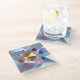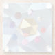 This coaster features an abstract art image centered around a metallic gold polyhedron. The polyhedron is multifaceted, reflecting light in a shimmering gradients and floats slightly above a background of subtly shifting light metallic blue polygons. Around the central polyhedron are geometric shapes in metallic red, silver, lavender, burgundy, pink, blue and purple, creating a harmonious arrangement. The coaster is a square glass coaster. The glass coaster is dishwasher safe.