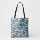 This beach theme tote bag features a Polynesian ocean pattern of teal and white waves, decorated with dots, and loverly teal blue flowers. Your monogram initial and name appear on a circle of light teal, with the initial in dark teal and the name in foamy off-white. This coastal style bag will remind you of the ocean whether you're headed to beach or luggage your books to class.