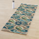 This tropical theme yoga mat will remind you of the beach, surf, and sand. Swirls of Polynesian waves reveal tropical blue and geen jewel tones of the South Pacific and palm trees in a retro style, remniscent of beach-inspired ethnic art or tattoos. Your initial appears in a teal green circle, with a double border in a sandy tan color.