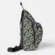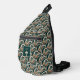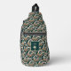 This Polynesian inspired vintage look sling bag features a pattern of palm trees and waves in green -- with a hint of teal, tan, brown, and creamy off-white. Your monogram initials appear in light tan against a color block of dark green, along with palm trees, for a custom look. If you or your recipient loves the beach, this tropical look sling bag might be the choice for you! It's especially great or travel and school. Make sure to type your initials in the Personalize section.