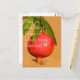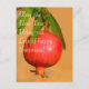 A single almost-ripe pomegranate graces the cover of this card. The pomegranate symbolizes prosperity and plenty because when you open it up you have a multitude of tasty and nutritious seeds that can used in so many ways: in salads, juices or cooked with other dishes. What a wonderful symbol for the Jewish New Year! The front of the card says: May the New Year bring you lots of happy surprises. On the back is an image of an opened pomegranate.
