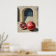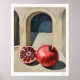 A still life of whole and cut pomegranates placed within an architectural setting of rounded arches. The composition combines traditional fruit study with Mediterranean-inspired interior forms, emphasizing structure, light, and contrast.