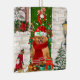Pomeranian Dog Christmas sitting outside decorated home with Christmas wreath, Christmas tree is a perfect Christmas gift idea for dog lovers.