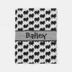 This custom fleece blanket features a silhouette of a Pomeranian dog tiled in the background and place for a name in the center.