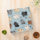 Cute Pomeranian dogs in black, gray, cream, chocolate and red coats sit and stand with scattered dog bones and paw prints on a light blue background.