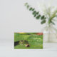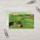 This business card advertises a pond service company which does pond planning, design, construction, maintenance, cleaning and management. It features a small green frog peering out from under lily pads. Luminous water droplets glow on the pads of this well-constructed pond. All text can be customized to suit your individual situation.