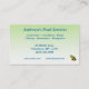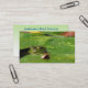 This business card advertises a pond service company which does pond planning, design, construction, maintenance, cleaning and management. It features a small green frog peering out from under lily pads. Luminous water droplets glow on the pads of this well-constructed pond. All text can be customized to suit your individual business.