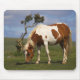 A piebald pony quietly grazing beside a lone gorse bush in Dartmoor National Park.