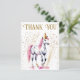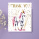 Pony birthday party cute white pony horse with pink long fringe gold sprinkles around pony horses birthday party thank you card, gold white pink themed horses pony birthday party thank you cards.