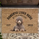 Poodle Personalized Dog lover welcome doormat. This welcome mat can be personalized with your dog’s name, the slogan can also be changed or you could use a picture of your own dog (make sure it's transparent). Text reads: Roberto lives here…. All treats welcome