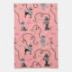 This cute French poodle kitchen towel design is derived from the classic poodle skirts of the 1950s. The pretty black and gray poodle dogs have gray pompons of fur with polka dots and a black stencil-style leash. It all rests on a vintage pink background with a light pink polka-dotted effect and bows.