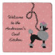 This cute French poodle stone kitchen trivet design is derived from the classic poodle skirts of the 1950s. The pretty black poodle dog has gray pompons of fur with polka dots and a black stencil-style leash. It all rests on a vintage pink background with a light pink polka-dotted effect.