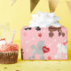 Cute Valentine's Day Poodles with in black, white, gray, apricot and brown color coats wearing red, pink, and white polka dot and heart sweaters with scattered paw prints and arrow on a pink background.