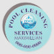 Set against a pastel blue background, which may be changed to any color of your choice, is a round logo filled with wavy water and three water droplets. The word "Pool" appears the water surface in pale blue and the graphic is edged with white. Dark blue text templates edged with a white border to make the lettering stand out hug the outside curve of this round business magnet and your name appears below the illustration in a horizontal font.
