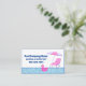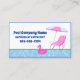 This colorful business card features a swimming pool cleaning or other services theme. The front has realistic looking water along the bottom portion, resembling a backyard pool. A pink flamingo floatie is bobbing on the water, and a pink lawn chair with umbrella is placed on the deck.