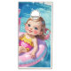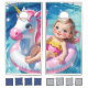 A cute young girl gently drifts on a pink and white unicorn float, gliding across a crystal-clear, blue swimming pool.