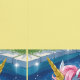 A cute young girl gently drifts on a pink and white unicorn float, gliding across a crystal-clear, blue swimming pool.