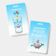 Pool party birthday badge with a cute illustration of a little whale. The whale is wearing a red and white striped party hat and has started the birthday party which takes place in a filled water glass.